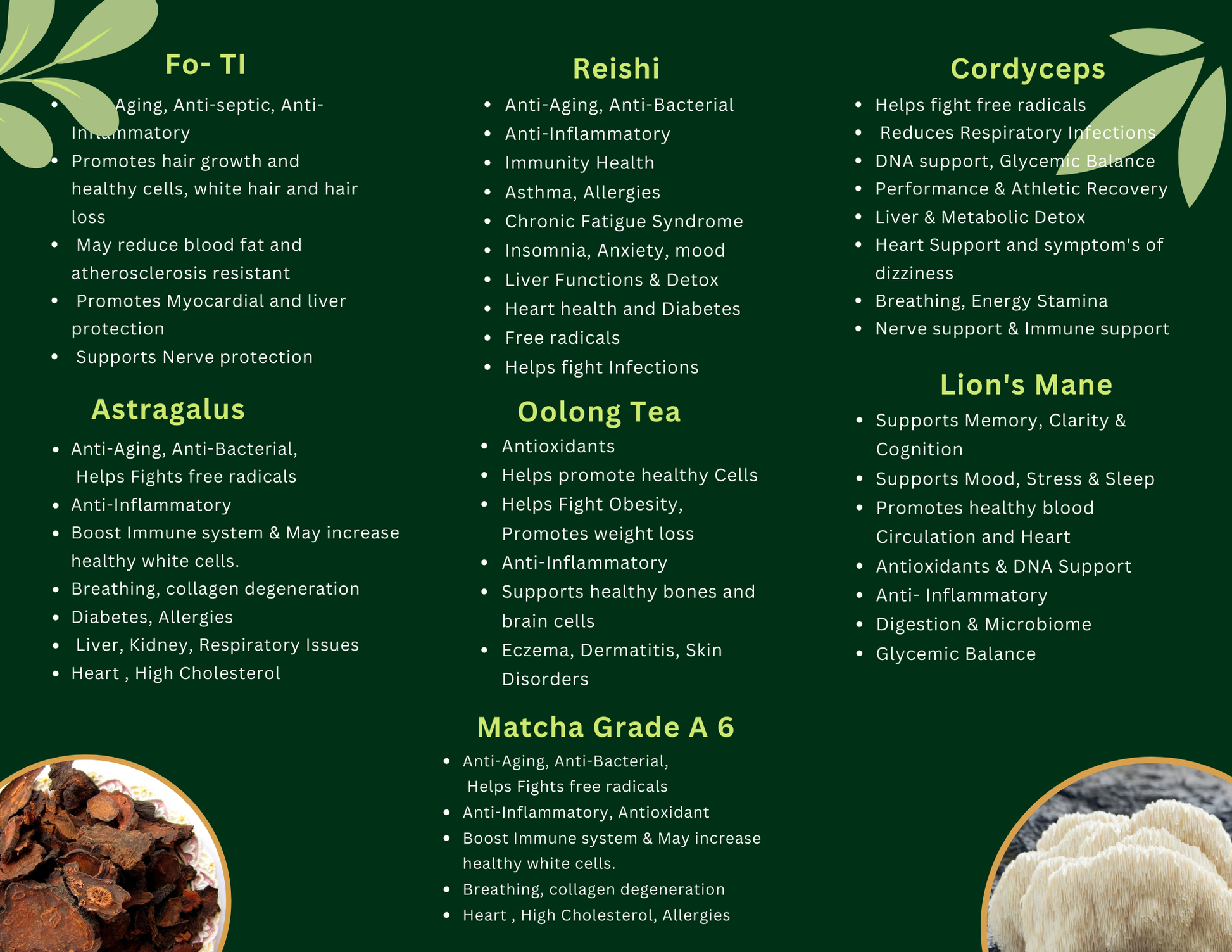 Lucuma, Organic Cordyceps, Organic Astragalus, Organic Fo-Ti, Organic Reishi,